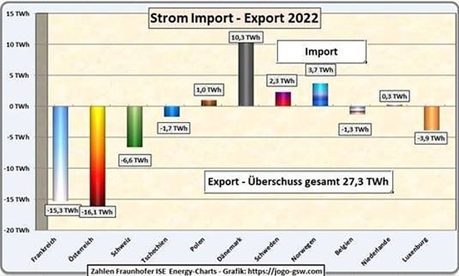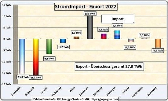Der Stromexportüberschuss 2022 ging der ÖDP zufolge an die Länder Frankreich, Österreich, Schweiz, Tschechien und Luxemburg. Deutschland importierte dagegen Strom aus den nordischen Ländern Dänemark, Schweden und Norwegen, hier vor allem Ökostrom. Der Exportüberschuss belief sich auch über 27 TWh Strom (=5,5 % der Stromerzeugung) und verhalf den Stromversorgern zu einem Gewinn von 3,2 Milliarden Euro. Frankreich saugte 2022 den europäischen Strommarkt quasi leer und dies führte zu den hohen Strompreisen, schreibt die ÖDP.